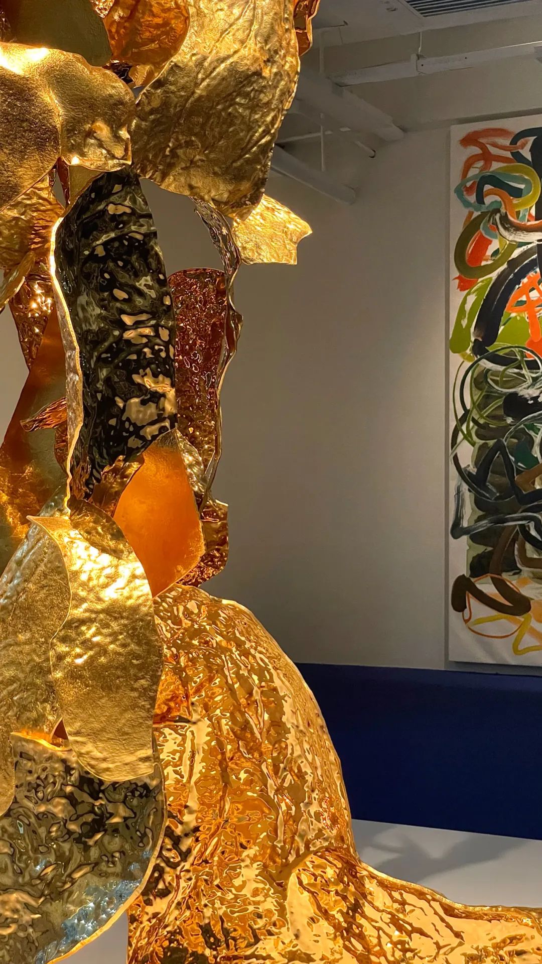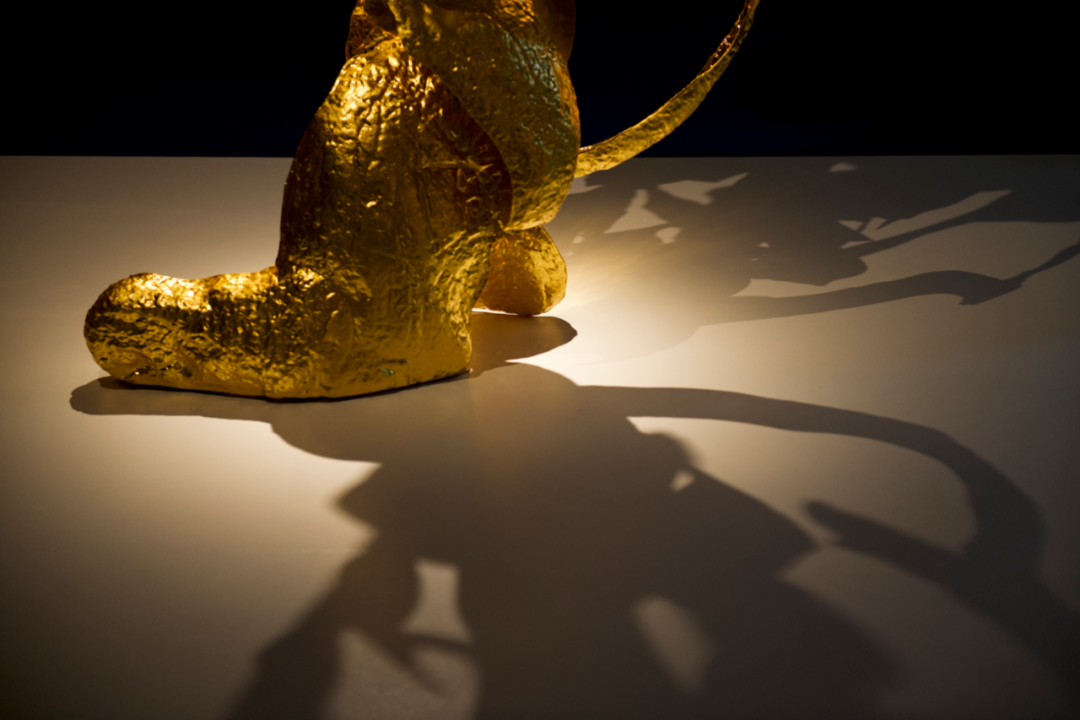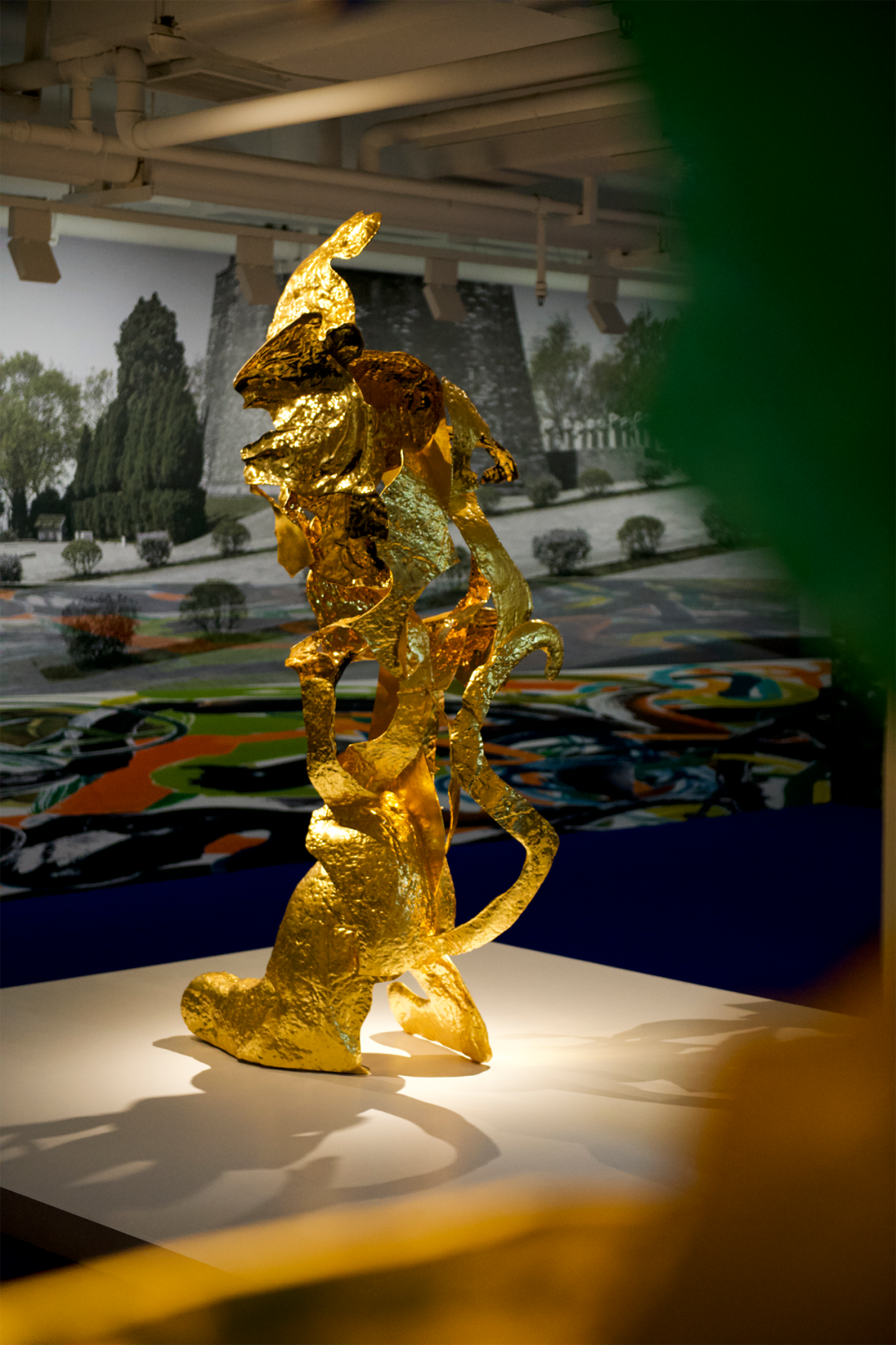 (左)《开壳——伏虎》,不锈钢、⾦箔、电镀、烤漆,82x240x130cm,2023年©邬建安
