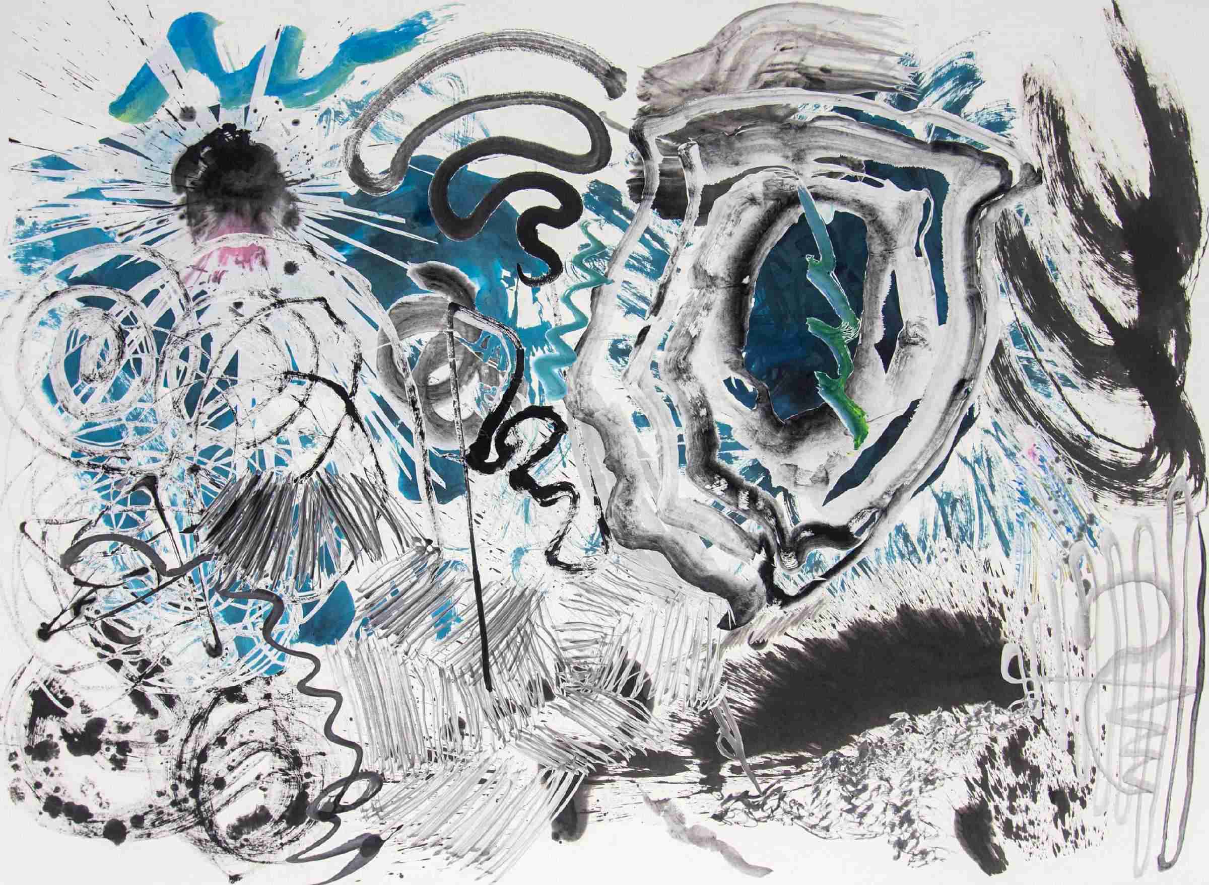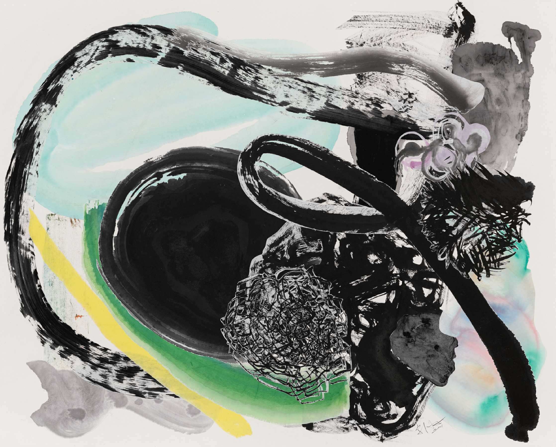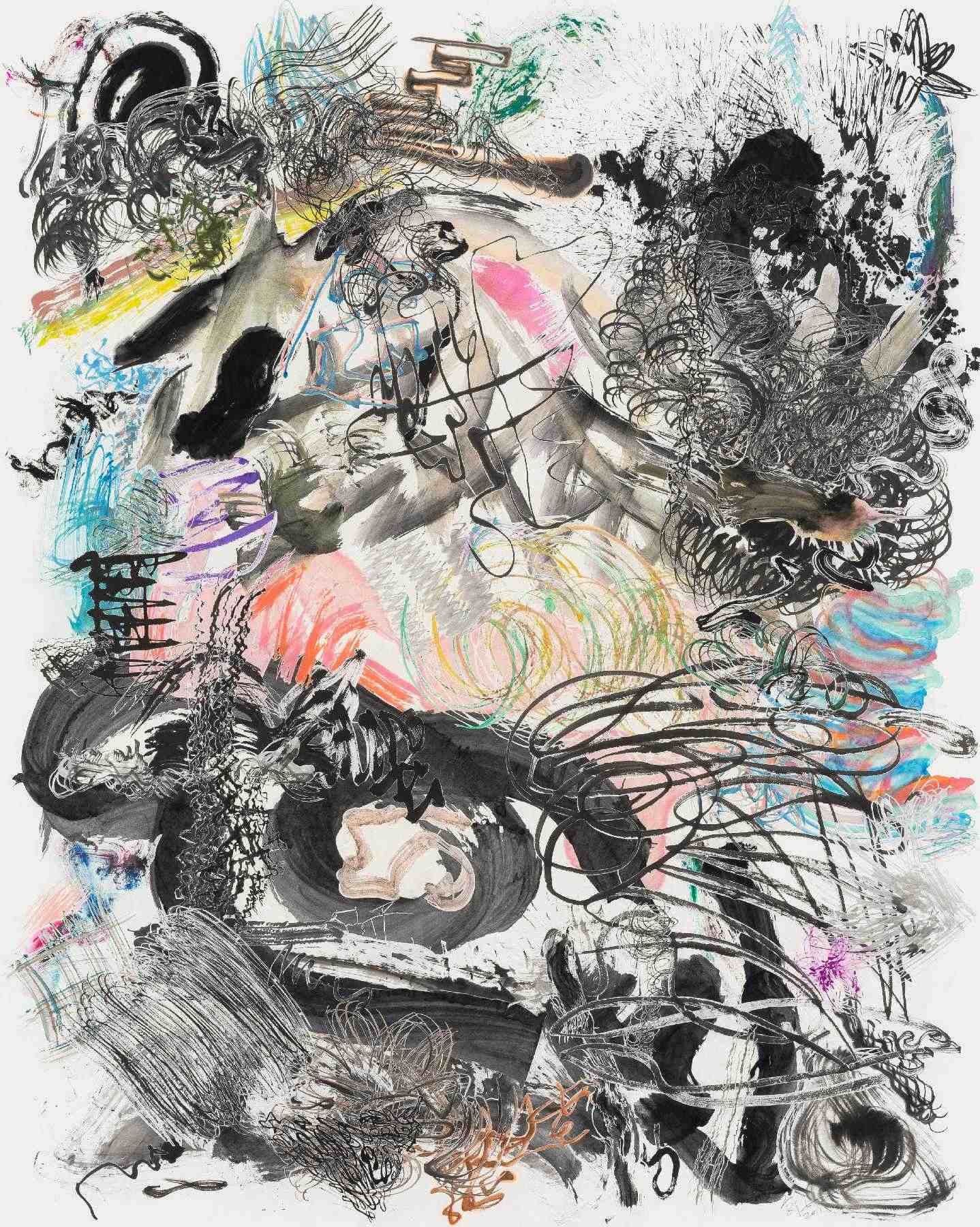《五百笔 #56》,纸本水墨、彩墨,剪纸拼贴于背绢宣纸,145x200cm,2019©邬建安