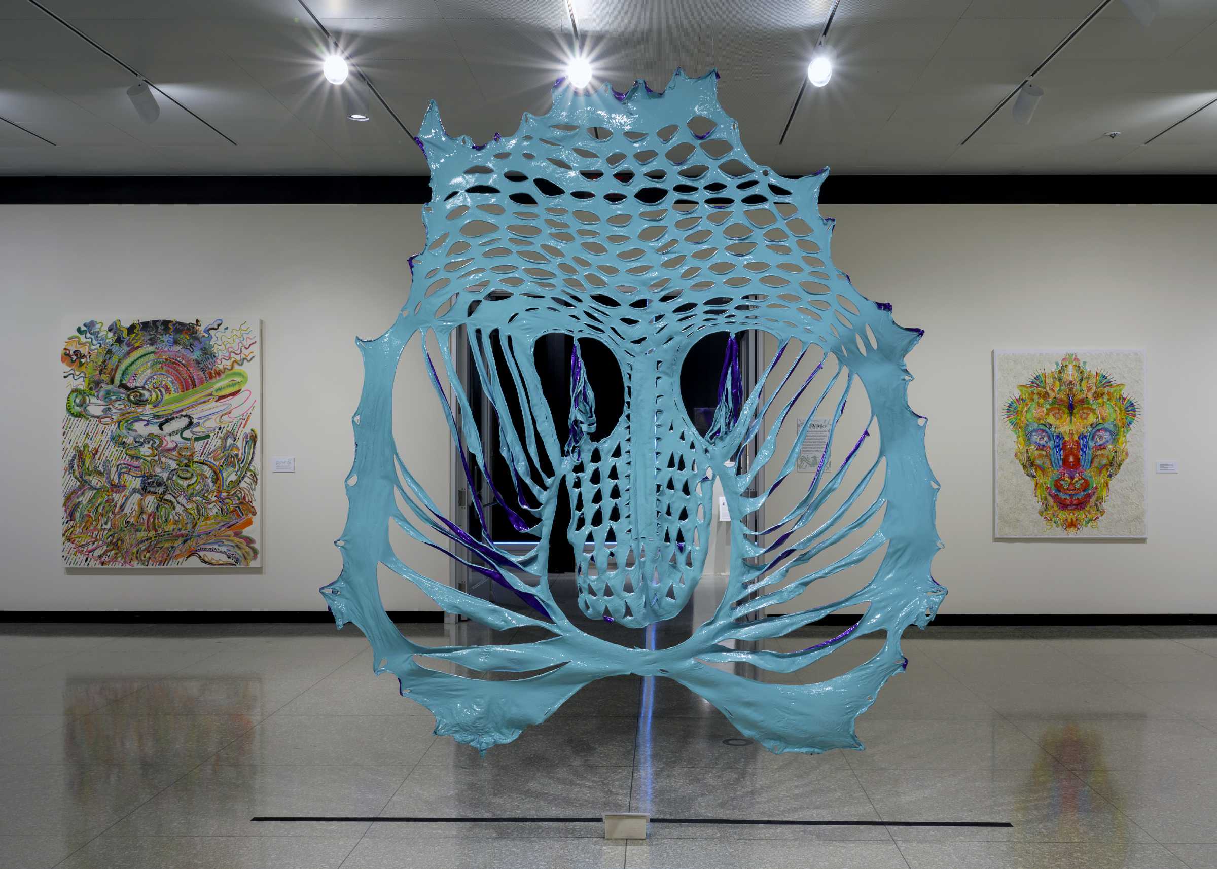 第一个主体空间于醒目处悬吊着若干件“面具”系列作品。在这个2018年开启的系列中,邬建安延续了对皮张材质的使用,以及通过镂刻进行个体表达标记的创作方法。创作时,艺术家直接在泡涨变软的回收牛皮皮张上留下大小不一、形状不同的切口,随着牛皮脱水、干燥,人为设计的切口形状变得面目全非,整体上越来越像古代玛雅、迈锡尼文明的面具,或者石器时代被提炼和图案化的面孔图腾。鲜亮的色彩“改换”了作品的材质,进而赋予作品某种超自然的形态转换:超越终会腐朽的物质媒介,与过去的文明对视。与此同时,作品也显现了人与自然既博弈又合作的复杂关系,同时也记录了人在与外界相处时或多或少的破坏欲,以及这些行为的徒劳——结果往往无法被追逐、设计、强加或者预见,只能通过在我们周围展开的复杂的成像来体验。