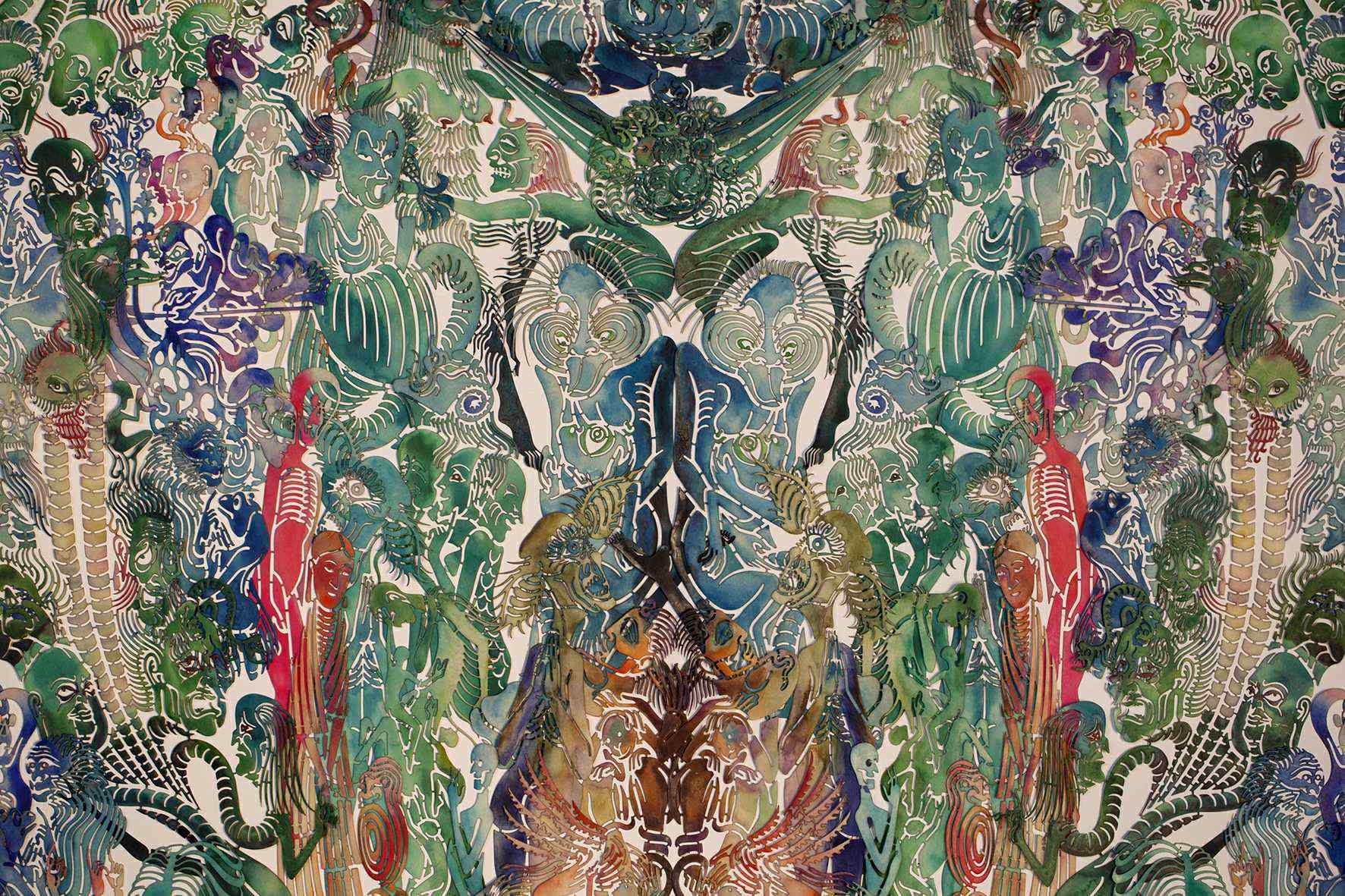 策展人指出,从《白日梦》开始的早期剪纸作品对邬建安的艺术生涯至关重要,这种历史悠久的民间技艺激发了艺术家更深入探索中国传统文化遗产的渴望。一方面,剪纸以镜像和复制为特色的构图方法为艺术家带来了极大的启发,并逐渐成为他常用的艺术语言之一;另一方面,艺术家通过剪刻进行个体标记的尝试也延伸至其他的系列创作中,层叠的彩虹纸张、百余个身份各异的小人形象,水牛皮上的切口、自由表达的笔画,都因剪刻而成为无数个独立的个体,突破了二维和二元的限制。随着作品规模的扩大,作品的主题基础变得愈加复杂,源自广泛的哲学、宗教和视觉传统。