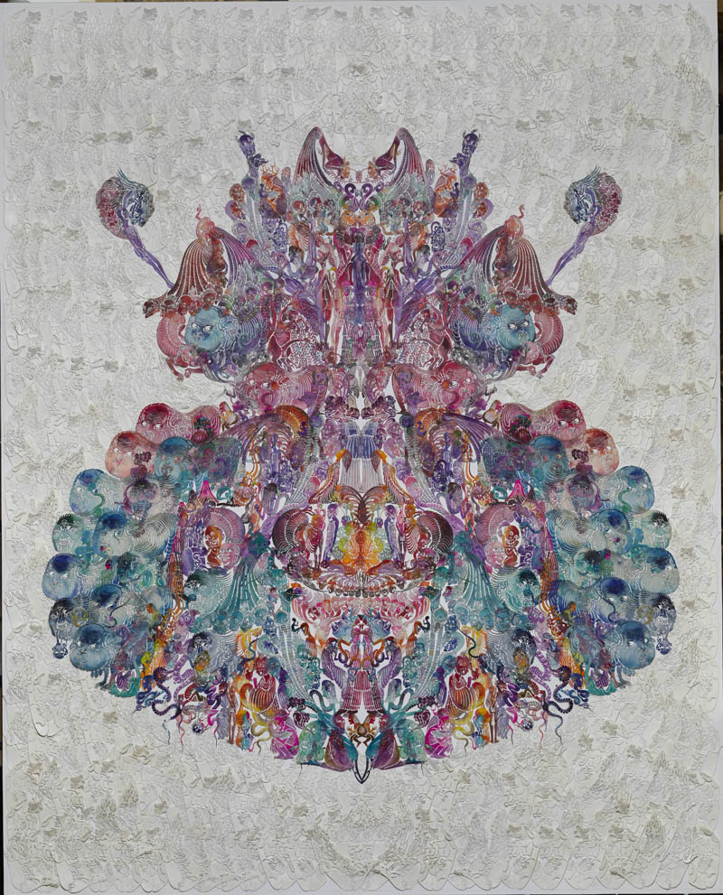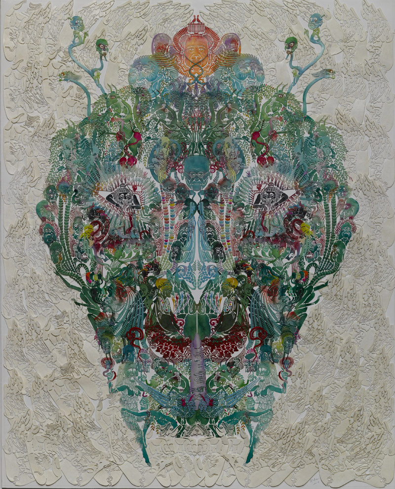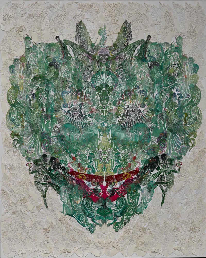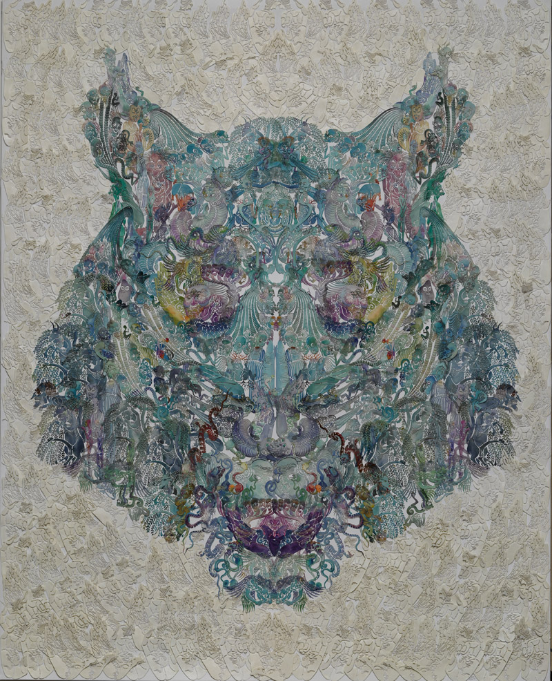 手工着色和浸蜡镂空剪纸, 棉线, 纸