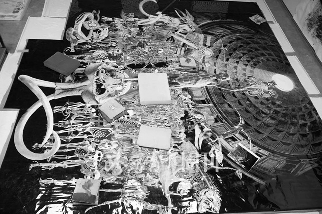 骷髅和怪物是邬建安的创作主题。在他的工作室里,我们看到了各种神奇的物种,骨架和皮毛倒着生长的猪、长着赤红的人脸的鸡、一只麋鹿的身体却长着一只狗的头颅、用贝壳串起来的骷髅大骨架, 地上的一幅硕大的画是用一只兔子画的……