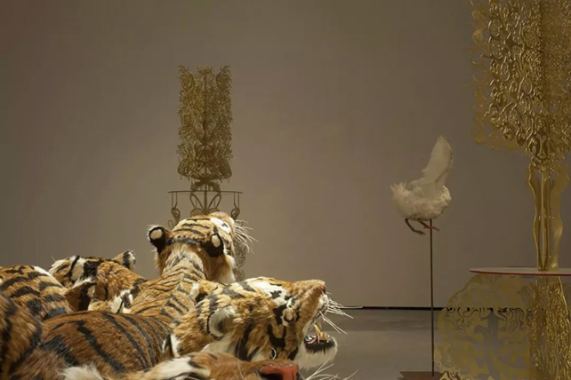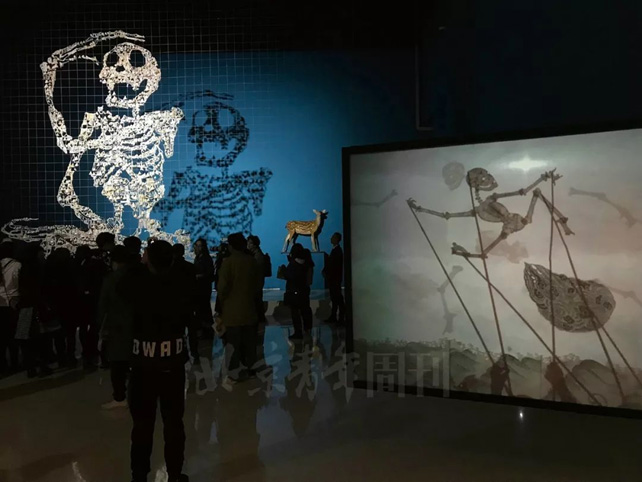 A:时代美术馆里有三四个厅我控制得比较多,大厅里因为“大骷髅架”身后阴影里边的动物显得很酷,旁边“万物”的厅效果也很好。时代美术馆是一个很标准的高大上的美术馆,牛皮的作品在展厅中特别酷,就像是迷宫一样。在威尼斯双年展的时候,参观的人太多了,像一锅煮沸的粥。回到北京每个厅都有一种让观众能沉浸进去的感觉,每个厅的气质差异也很大。
