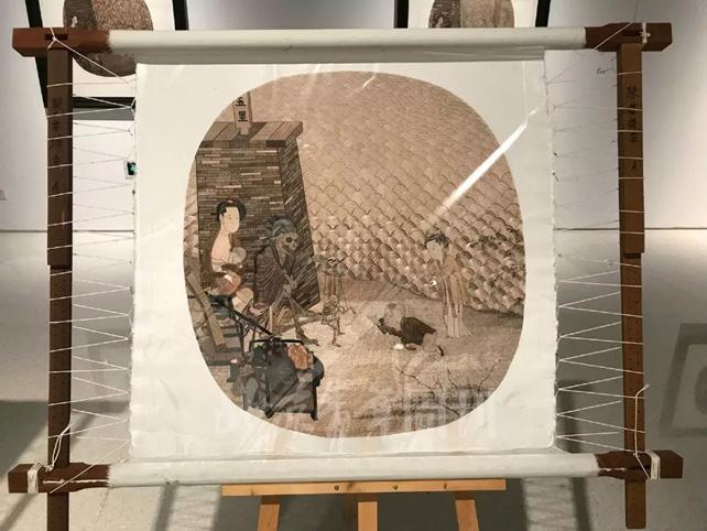 其中令人印象深刻的作品,是由邬建安与汇集苏绣艺术大师姚惠芬合作而成的《崖山》。它是基于宋代李嵩著名作品《骷髅幻戏图》而创作的,那是一幅很奇特的画,至今难解,画面上一具大骷髅像玩提线木偶一样提着一只小骷髅,身后的妇人袒胸奶着一个孩子,另一个妇人则担忧地伸出手去,似乎想要阻拦她在地上的婴孩向骷髅爬去。