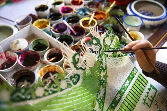 Craftsmen color the shadow puppets to give them a modern look.[Photo provided to China Daily]