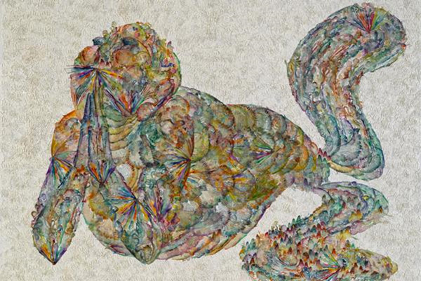 On display are installations such as one that shows a snake casting off its skin and two chicken monsters battling with a snake.