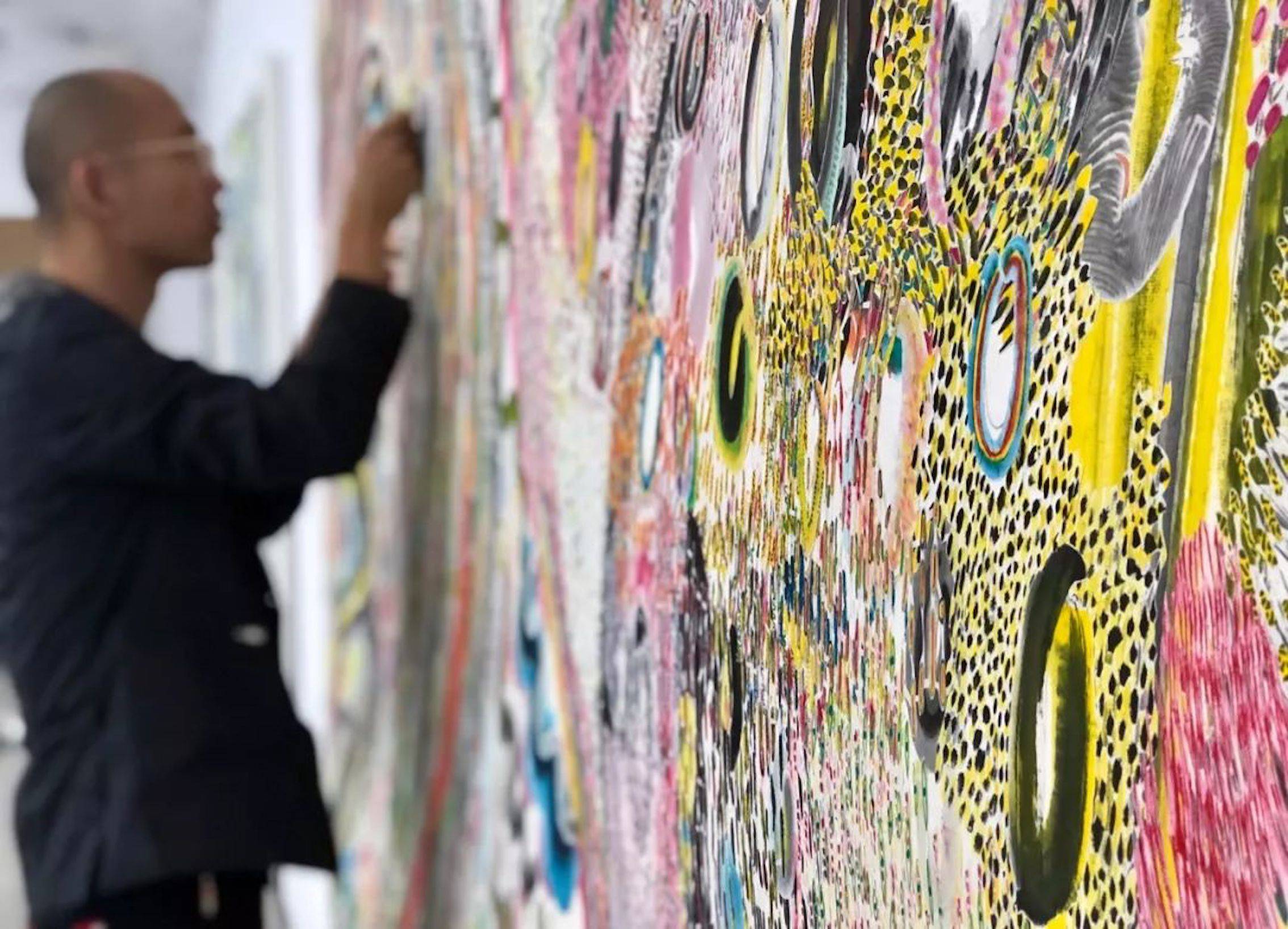 Perhaps the most striking departure in this period during which he achieved artistic maturity was the appearance in 2016 of a series of dynamic calligraphic abstractions under the general title 500 Brushstrokes. These were included in the 2016 exhibition Ten Thousand Things that took its title from the influential book Ten Thousand Things: Module and Mass Production in Chinese Art by Lothar Ledderose, an investigation into the use of modular and standardized production systems throughout the history of Chinese art in bronzes, porcelain, and architecture. There had been an abstract component in the 2014 exhibition Transformation in works such as Color Points and the various versions of Color Balls conceived as part of the underlying theme of spiritual transformation embodied in the figurative painting Nirvana of the White Ape although it is not an approach that he has investigated in any great depth since that period.