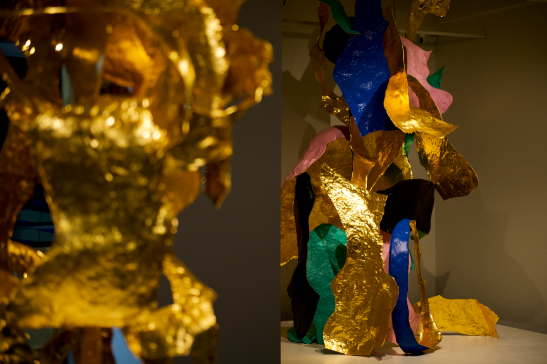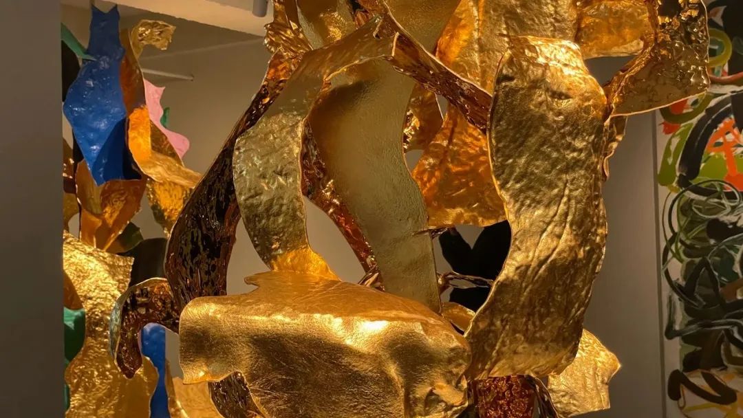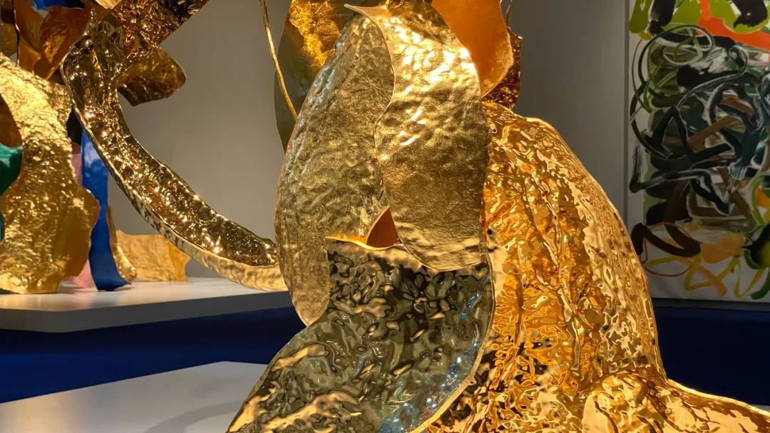 (左)《开壳——伏虎》,不锈钢、⾦箔、电镀、烤漆,82x240x130cm,2023年©邬建安