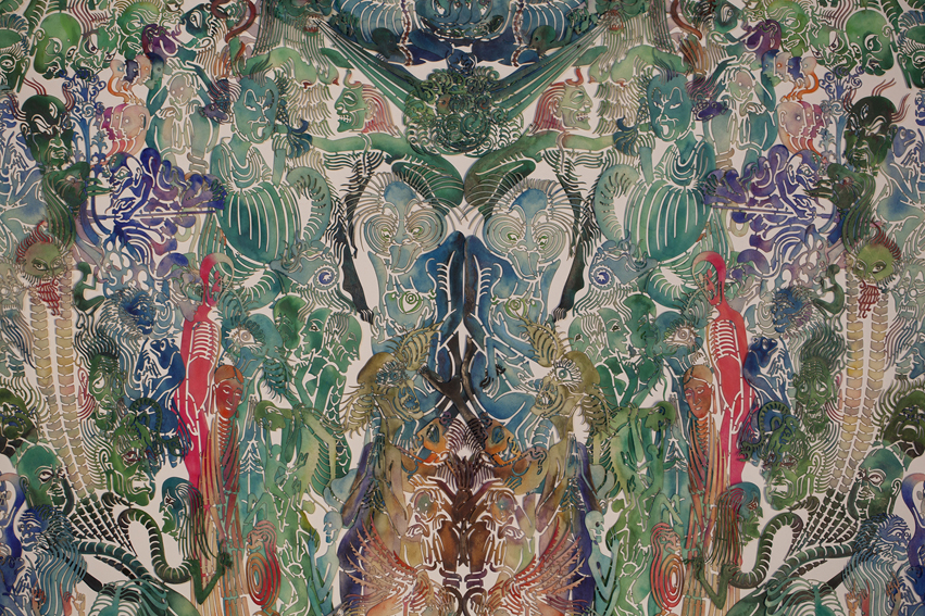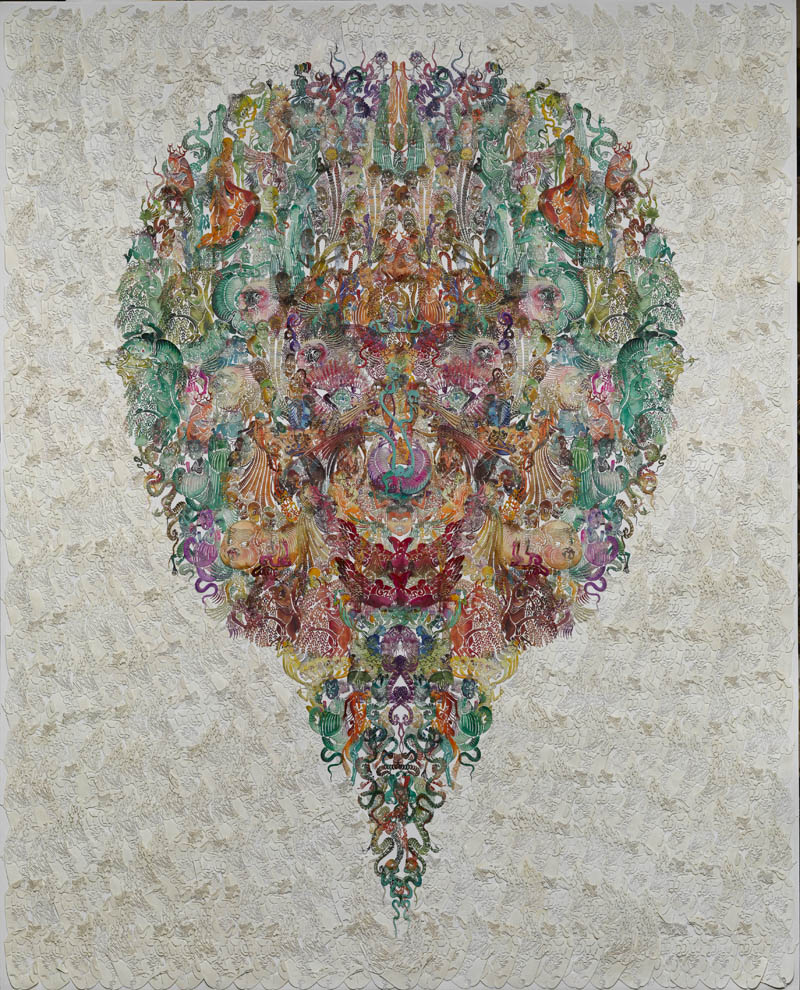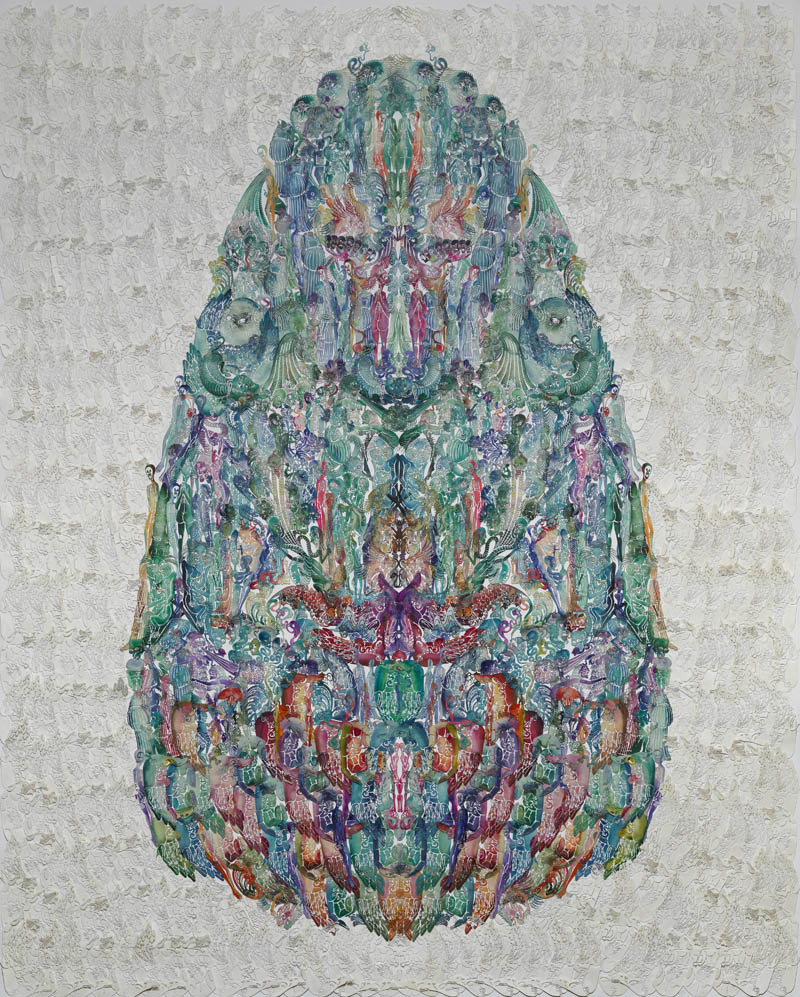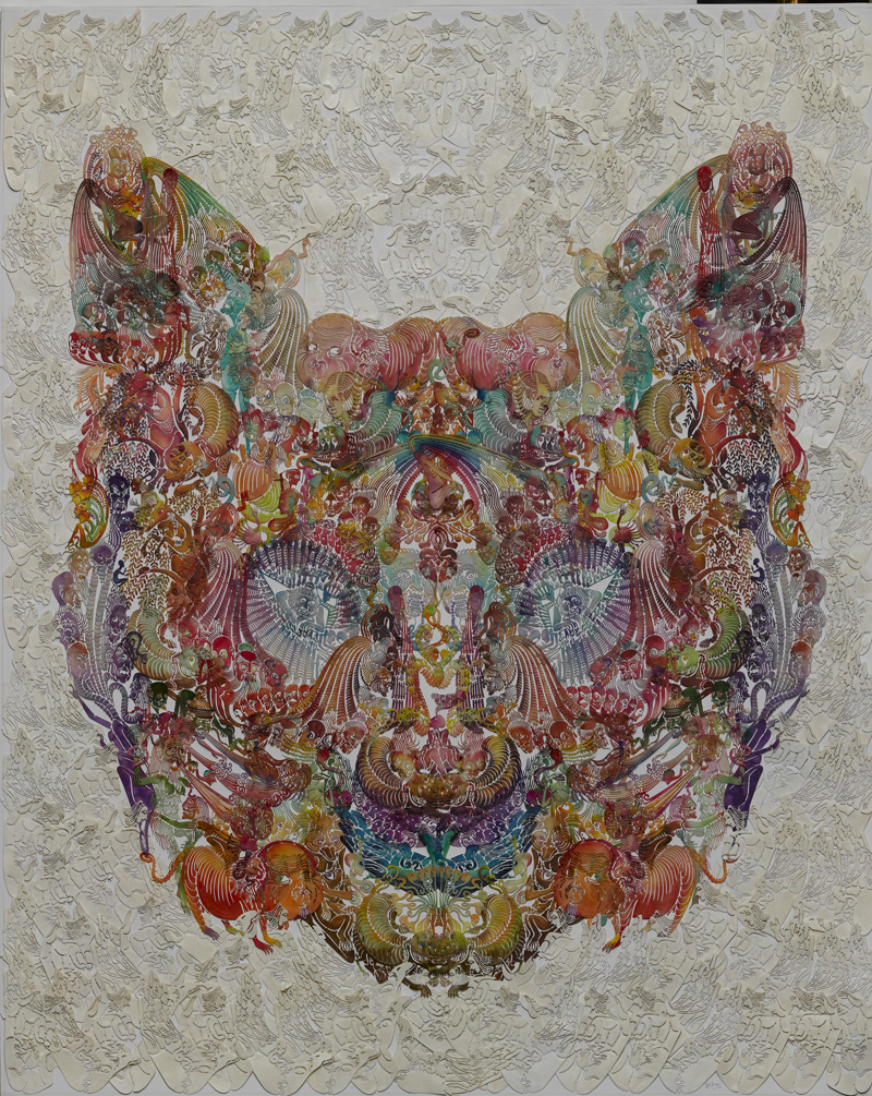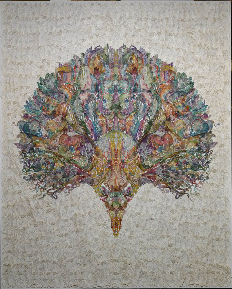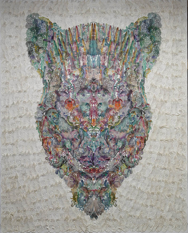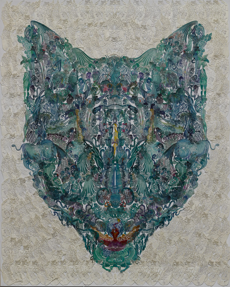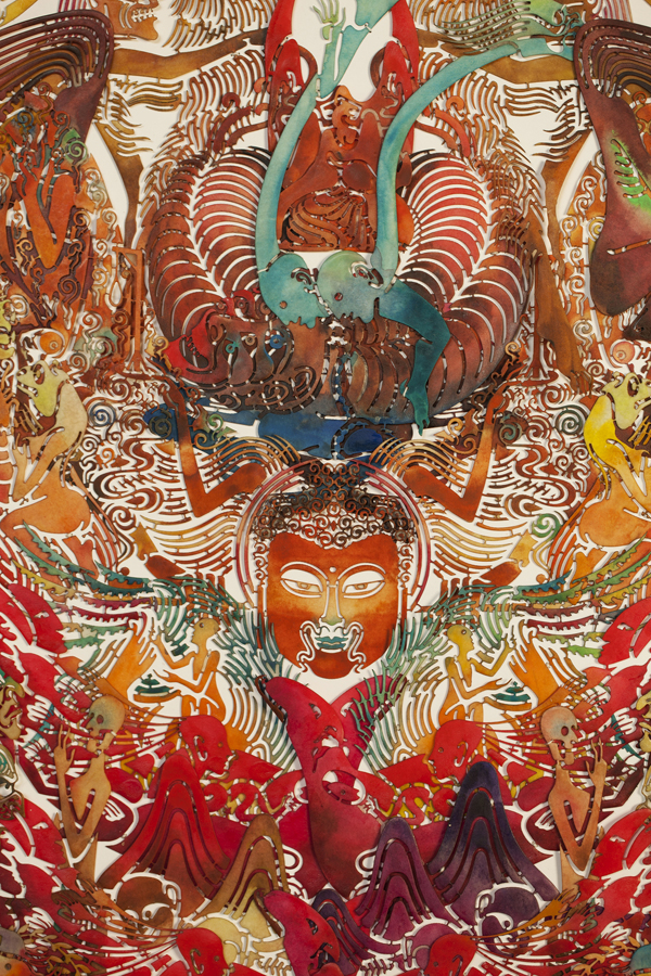手工着色和浸蜡镂空剪纸, 棉线, 纸